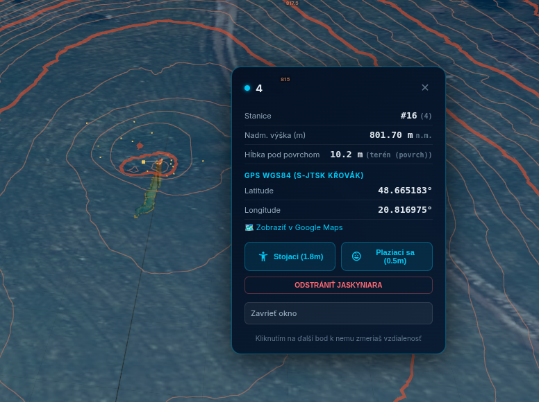 - Hĺbka pod povrchom: Jedným klikom v jaskyni zistíte presnú vertikálnu vzdialenosť k povrchu.
